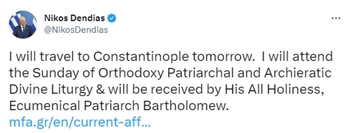 “Yarın Türkiye ve Suriye’deki son sarsıntıların kurbanları ve Tempi demiryolu kazası kurbanları için İstanbul ‘da, @EcuPatriarch anma merasimine katılacağım.”
